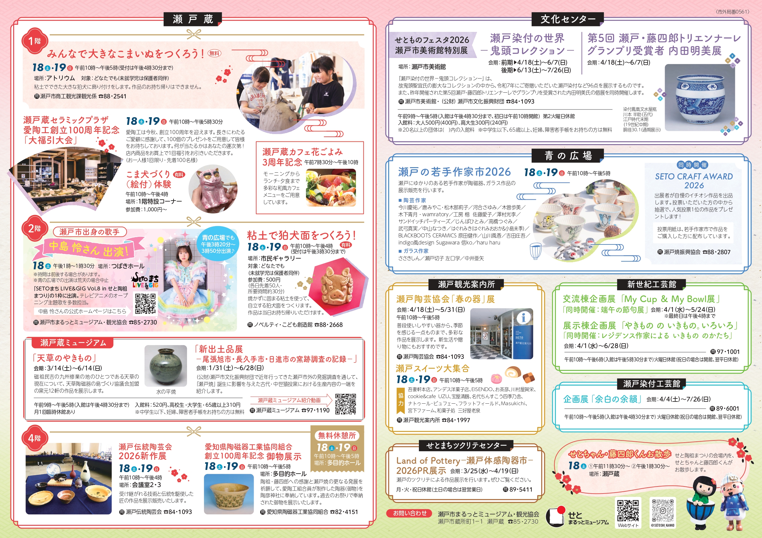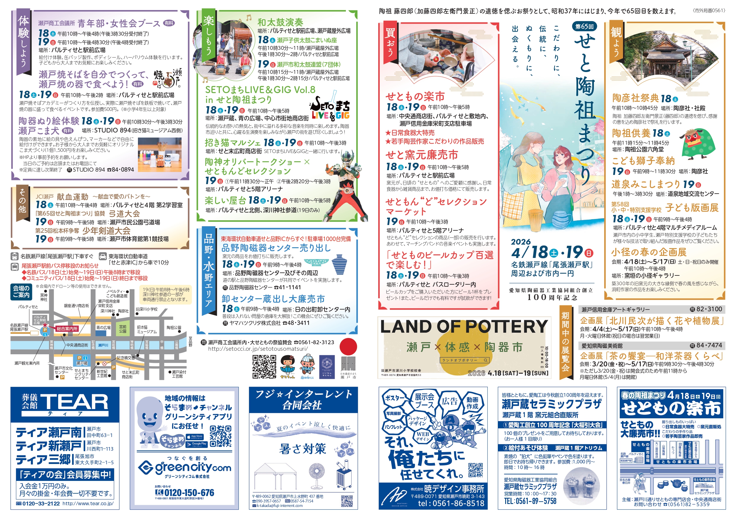 4月18日(土)・19日(日)の2日間、名鉄瀬戸線「尾張瀬戸駅」周辺及び市内一円で、春のお祭り「せと陶祖まつり」が開催されます。せともの楽市やせと窯元廉売市、若手作家市、「せとものビールカップ百選で楽しむ!」など、お気に入りのやきものに出会えます。その他にも、瀬戸こま犬の陶器ぬり絵や瀬戸焼きそばのつくり方などを体験していただいたり、ご当地ヒーロー陶神オリバーのトークショーや和太鼓の演奏、子ども版画展、SETOまちLIVE&GIG in せと陶祖まつりなど、大人から子供まで楽しめる催しが盛りだくさん。ぜひお出かけください。